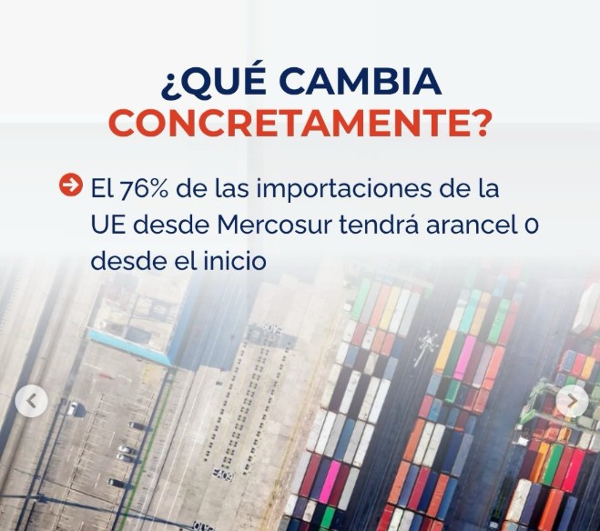 Entre los principales efectos, se prevé la reducción de aranceles en determinados productos y una mayor apertura del comercio entre Europa y los países del Mercosur: Argentina, Brasil, Paraguay y Uruguay. 📦